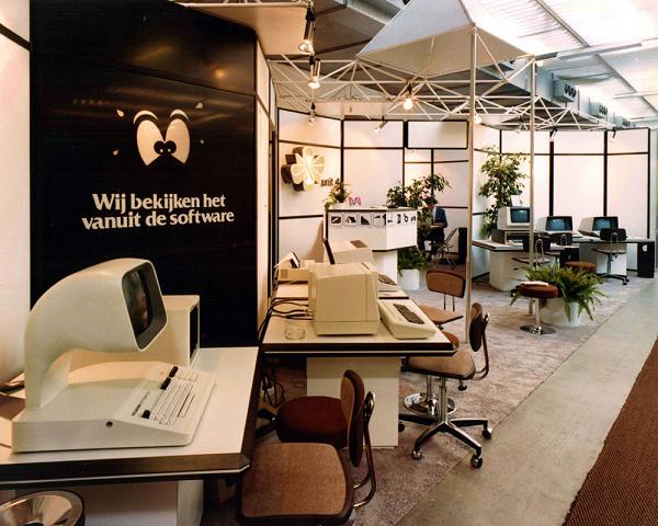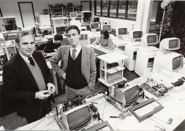 Dick Gerdzen links en Hans Polak rechts op de foto. Op de voorgrond zijn Beehive terminals te zien. De inhoud werd voor de eerste Holborn 9120 terminals gebruikt. Alles om maar zo snel mogelijk de markt op te komen. |