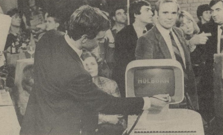 Het Nederlandse product werd zo ook in het programma Brandpunt gepresenteerd. Hans Polak demonstreert hier de machine en Dick Gerdzen staat achter de machine. |