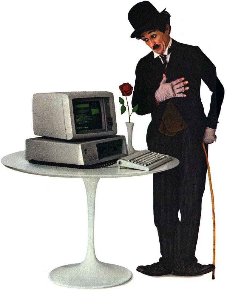 maar de open systeemstructuur en IBM's marketingskracht des te meer. Zelfs Charlie Chaplin werd in de reclames voor hun karretje gespannen. IBM was al een bekende speler op de professionele markt. Dus vertrouwen in de IBM PC was snel gewonnen. |