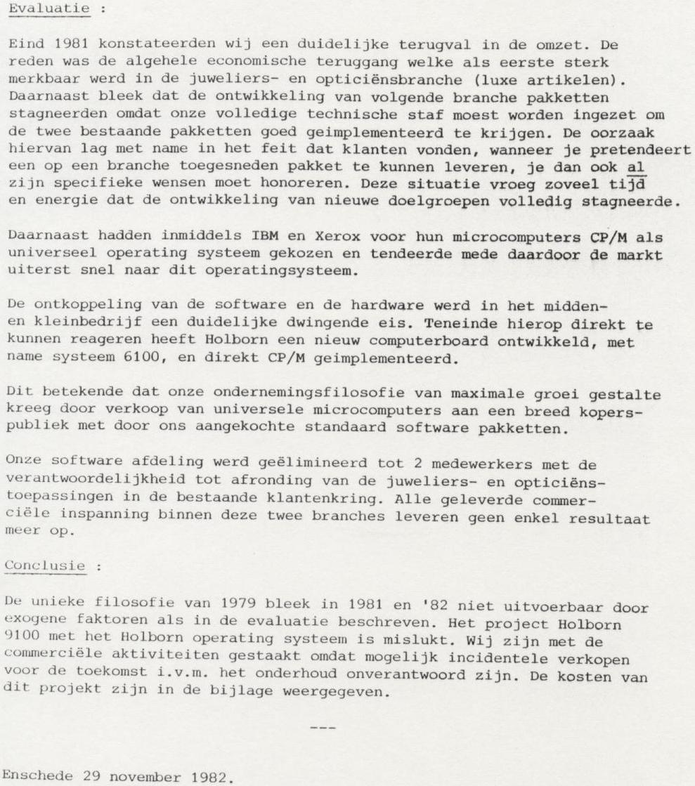 en Holborn was op dat moment afhankelijk van externe financiële middelen. Er werd een financieel plan opgesteld voor 1983. Maar het zag er niet rooskleurig uit. Eerdere ontwikkelingen waren ook al deels betaald vanuit subsidies. Zoals hieronder te lezen valt is het project 9100 in de ogen van Holborn mislukt. |
