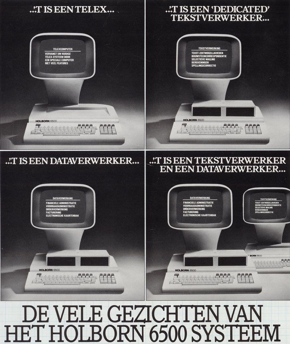 later ook te opwaarderen naar een 9100 systeem. Zo bleef het groeiprincipe overeind. De 9100 en 7100 computers draaide alle programma's en het besturingssysteem HOS (Holborn Operating System) uit ROM. De data kon opgeslagen worden op 8" diskettes. De machines werden dan klantspecifiek gemaakt. Er zijn diverse folders voor bijvoorbeeld de juwelier, opticien, klein bedrijf enz... (zie downloads) Door de software in ROM was de machine echter weinig flexibel. CP/M was sterk in opmars en het werd tijd om ook deze markt te gaan bedienen. Bovendien bleek er vraag te zijn naar nog kleinere en persoonlijke computers zonder systeemgedachte welke duur betaald werd. Om uiteindelijk in de CP/M wereld mee te kunnen draaien heeft Holborn een 6100 systeem ontwikkeld. Deze staat ook in het Technisch Museum. Er bestaat nog wel onduidelijkheid over welke machines nu bepaalde software kunnen draaien. Volgens de folders kan een 9100 ook CP/M draaien en een 6100 zou ook HOS ondersteunen. Volgens diverse oud medewerkers was dit niet zo. Niet alle opties die in de folders genoemd werden waren ook echt mogelijk. Maar er zijn ook personen die melden dat de 6100 wel degelijk HOS kon draaien en de 9100 CP/M. Er zijn echter geen harde bewijzen van gevonden tot nu toe. Er is geen 9100 systeem bekent welke CP/M draait en geen 6100 welke HOS draait. |